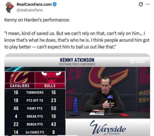 因此哈登也成为骑士队赢球封面人物,骑士官方赛后专门发文称赞到:“大胡子在芝加哥大显身手。”
