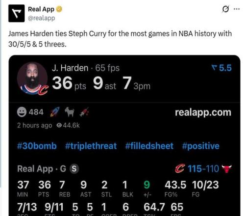 最后本场是哈登生涯第105场砍下至少30分5板5助+5三分,成功追平库里并列历史第一。
